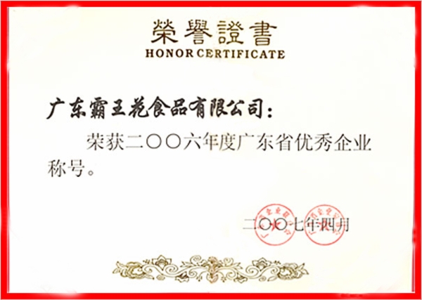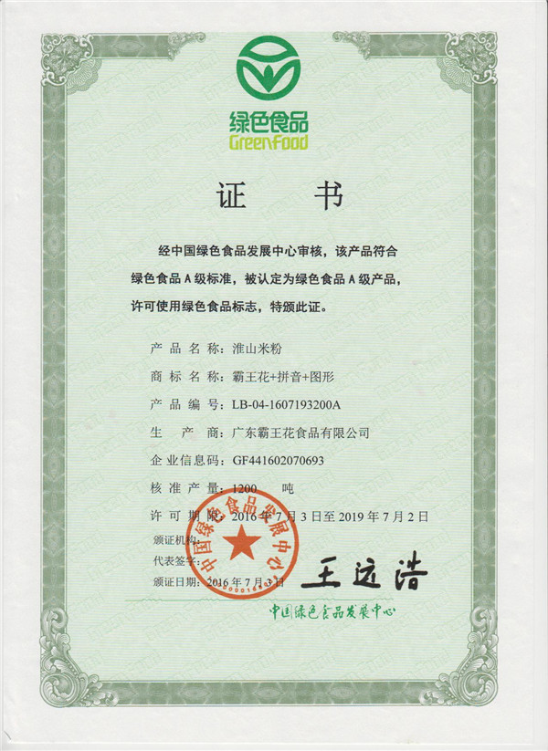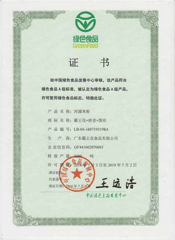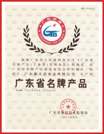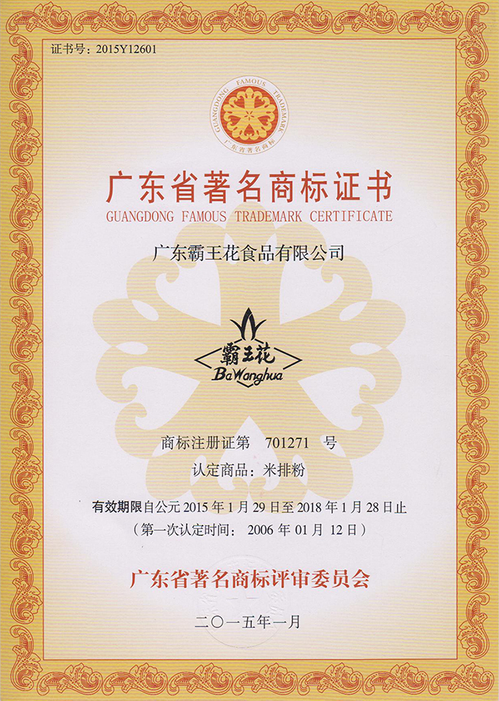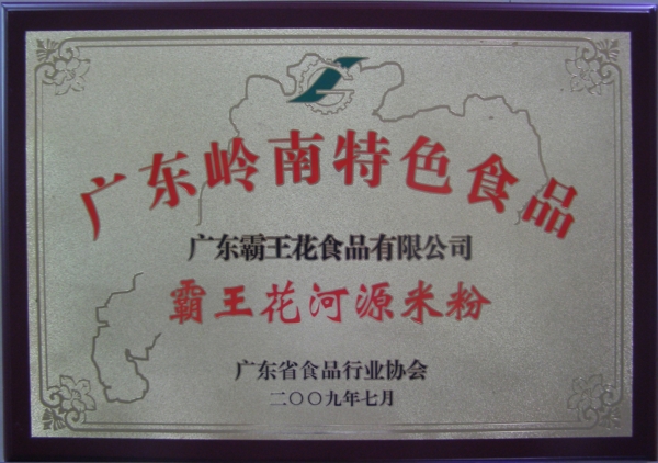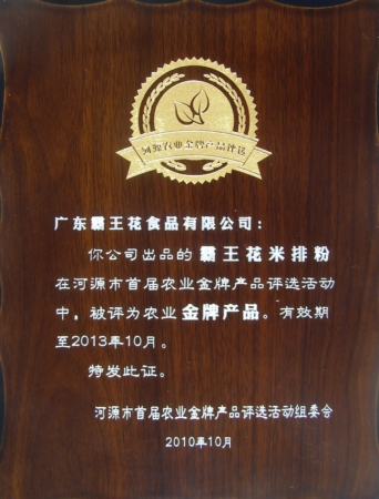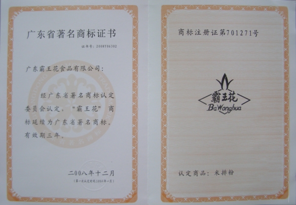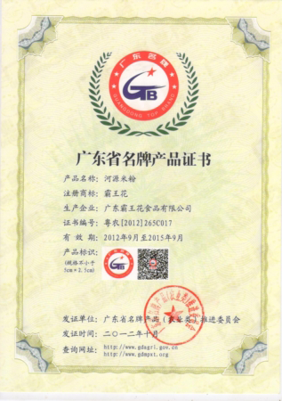 由廣東省名牌產品推進委員會頒發的注冊商標為“霸王花”的河源米粉——廣東省名牌產品。