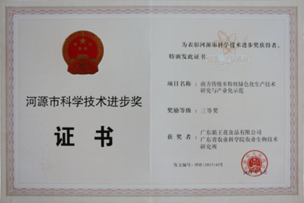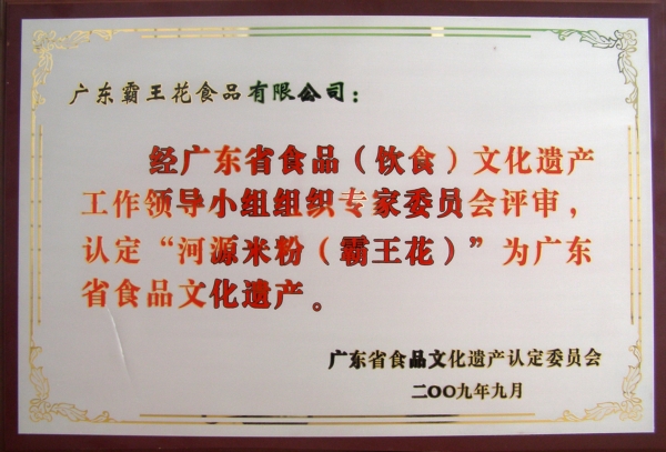 公司生產的“霸王花”牌河源米粉于2005經廣東省食品行業第一個受到國家地理標志保護的產品,獨具特色的傳統制作工藝被列為廣東省食品文化遺產保護項目。