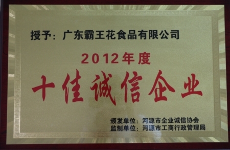 由河源市企業誠信協會與河源市工商行政管理局聯合授予的“2012年度十佳誠信企業”。