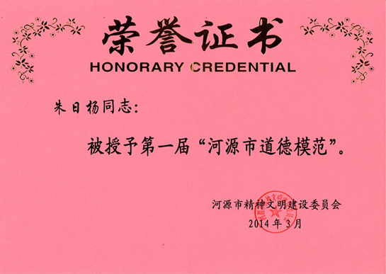 董事長榮獲“第一屆河源市道德模范榮譽”