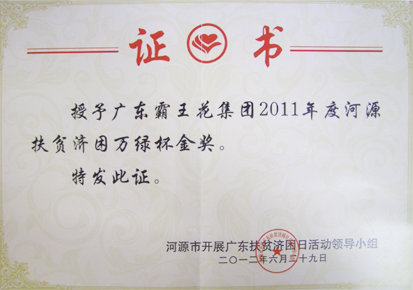 由河源市開展廣東扶貧濟困日活動領導小組授予的“廣東霸王花集團2011年度河源扶貧濟困萬綠杯金獎。
