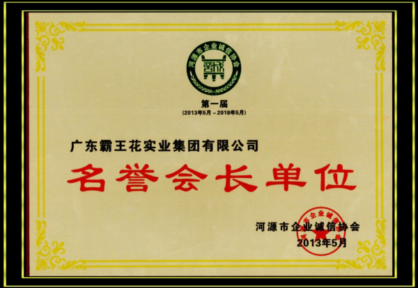 2013年5月由河源市企業誠信協會頒發的第一屆“名譽會長單位”牌匾