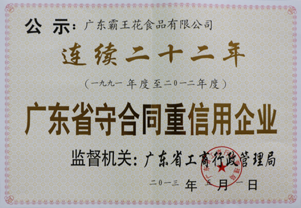 由廣東省工商行政管理局頒發的連續二十二年廣東省守合同重信用企業