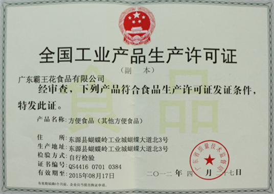 由廣東省質量技術監督局頒發的“經審查,下列產品(方便食品)符合食品生產許可證發證條件,特發此證”。