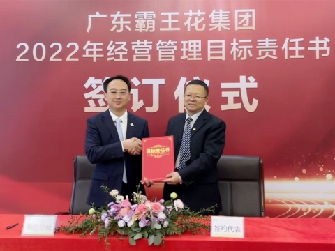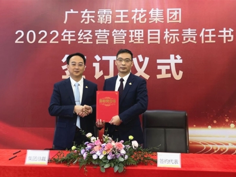 2022年1月21日,廣東霸王花集團2022年度工作會議暨2022年度經營管理目標責任書簽約儀式在集團本部多功能會議室舉行。集團董事長朱日楊、總裁朱榮業、黨委書記羅友望、副總裁陳駿良、副總裁兼財務總監朱利昀出席了會議及簽約儀式。參加會議的還有集團投資發展部總經理黃冠、霸王花食品公司總經理熊傳軍、旺源房地產公司常務副總經理陳永輝、新河實驗學校總校常務副校長謝輝華、旺源典當公司總經理朱禮彬、新河實驗學校附屬第一幼兒園園長葉海燕、德康醫院院長解小會、德康醫院副院長(集團派駐德康醫院管理代表)葉海濤,以及集團本部各職能部門負責人、各下屬子公司部門負責人及以上人員。年度工作會議及簽約儀式由集團副總裁陳駿良主持。
